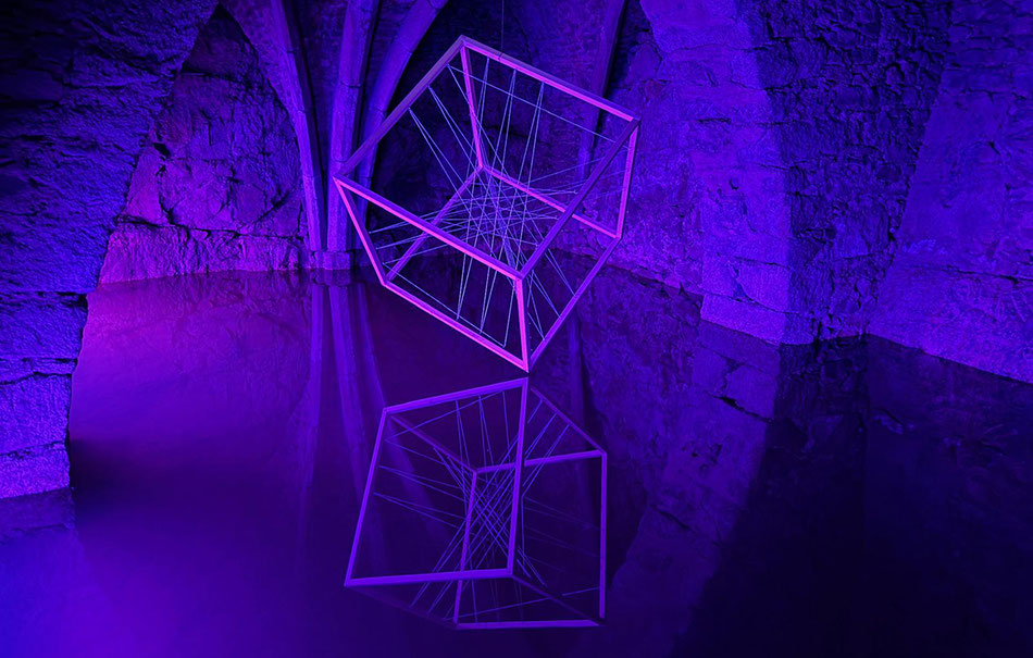 "XXX" | Raum-Klang-Installation | 140x140cm Würfel bespannt | Zusammenarbeit D. Helm | Zisterne | Weitra NÖ | 2025